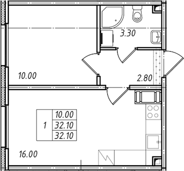 Однокомнатная квартира на 6-ом этаже 32,1 кв.м