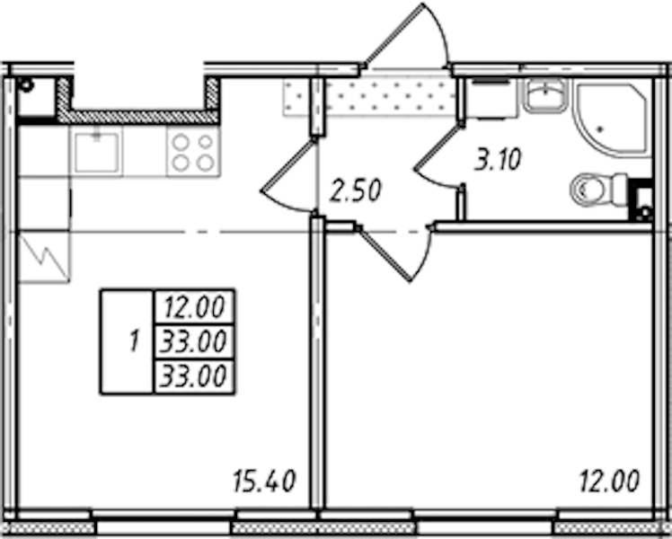 - Площадь кухни15,4 м2