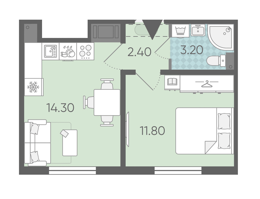 - Площадь кухни14,3 м2