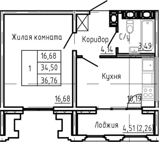Однокомнатная квартира на 17-ом этаже 36,76 кв.м