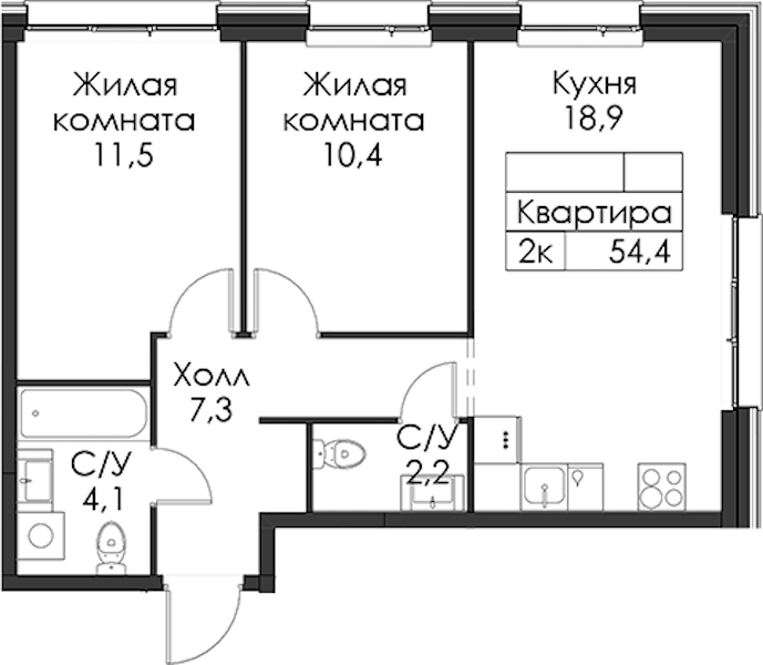 - Площадь54,4 м2