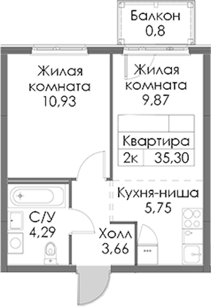 Однокомнатная квартира на 10-ом этаже 35,3 кв.м