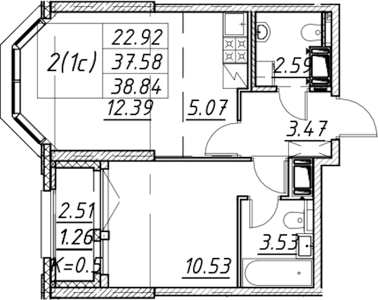 - Площадь38,84 м2