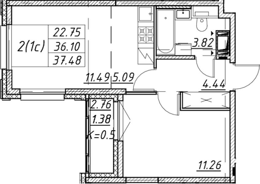 - Площадь37,48 м2