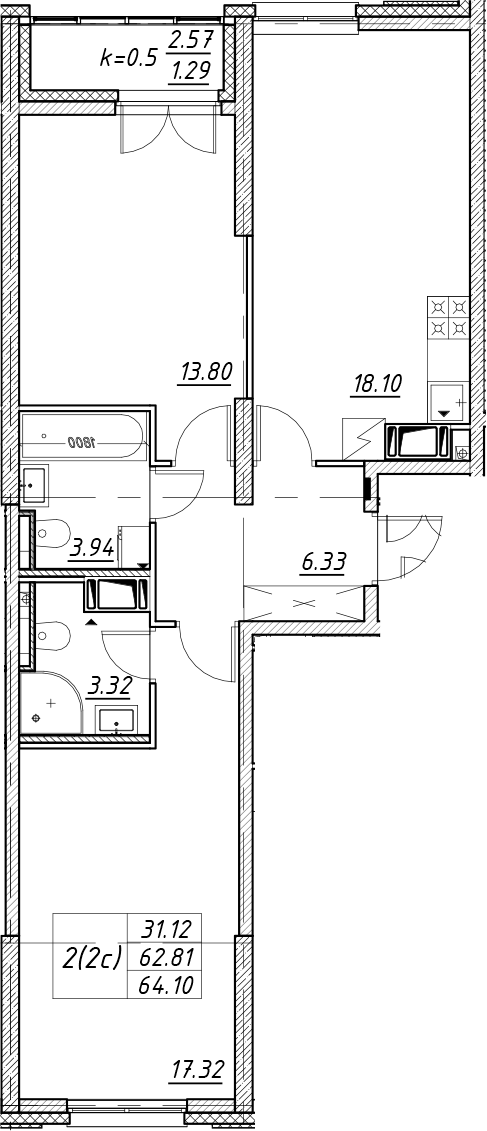 - Площадь кухни18,1 м2