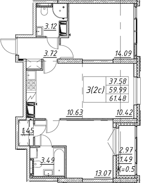 - Площадь61,48 м2