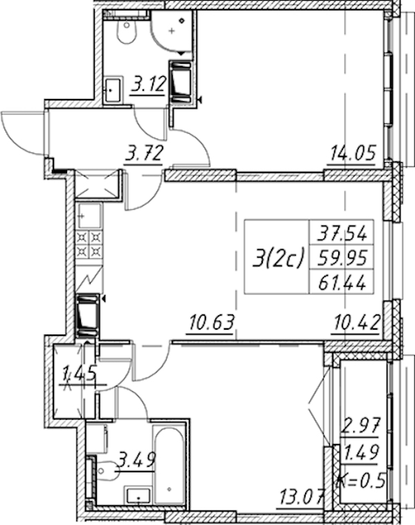 - Площадь61,44 м2