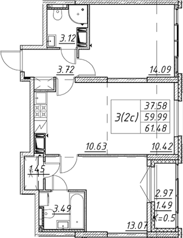- Площадь61,48 м2