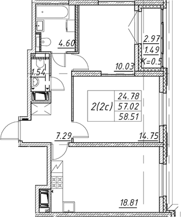 - Площадь58,51 м2