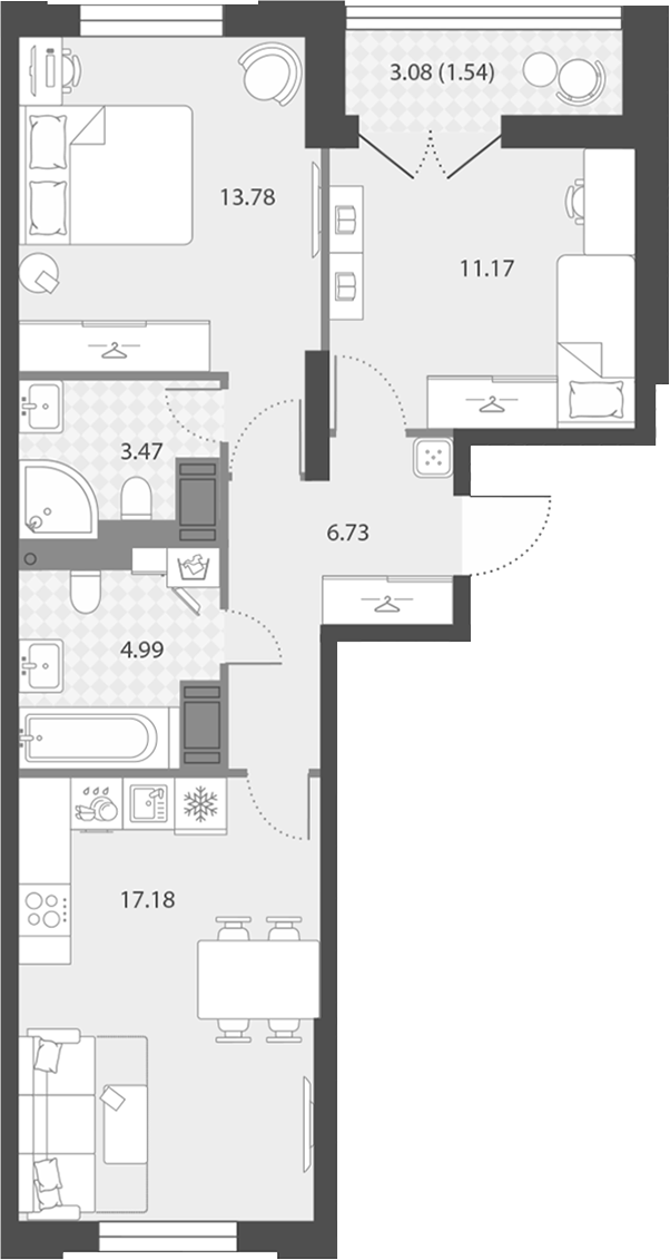- Площадь кухни17,18 м2