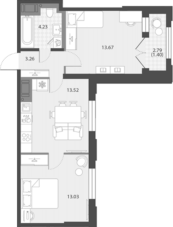 Двухкомнатная квартира на 14-ом этаже 49,11 кв.м
