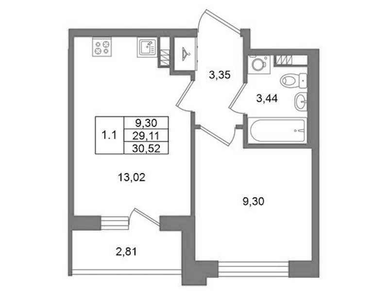 Однокомнатная квартира на 4-ом этаже 29,11 кв.м