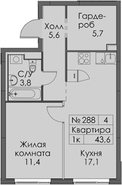 - Площадь43,6 м2