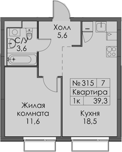 Однокомнатная квартира на 7-ом этаже 39,3 кв.м