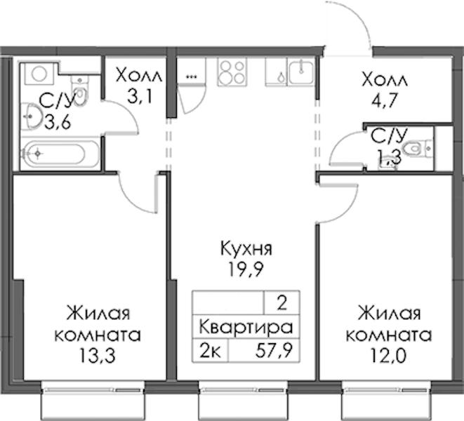 • Площадь57,9 м2