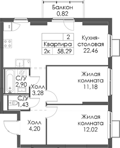 Двухкомнатная квартира на 4-ом этаже 58,29 кв.м