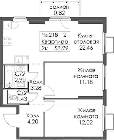 - Площадь58,29 м2