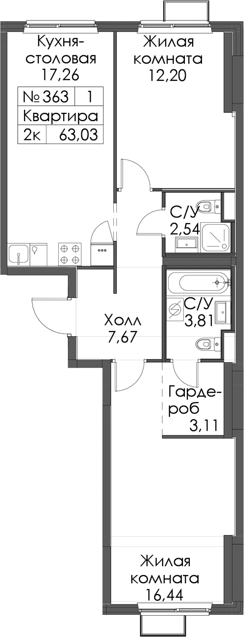 Двухкомнатная квартира на 16-ом этаже 63,03 кв.м