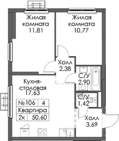- Площадь50,6 м2