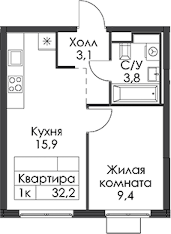 Однокомнатная квартира на 18-ом этаже 32,2 кв.м