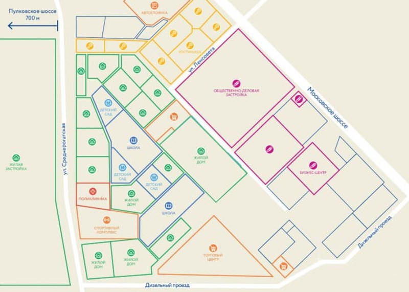 Сначала стройка развернулась вдоль Пулковского шоссе и большинство домов там уже сдано. С точки зрения развития трансплртной сети и торговой инфраструктуры – это были лакомые кусочки. Автобусы и маршрутки ездят по Пулковскому шоссе до метро “Московская”, в аэропорт, в Петергоф, Пушкин, Павловск и другие исторические пригороды. Напротив жилого массива находятся торговые комплексы “Лето”, “OBI”, “Metro”, гипермаркет “Окей”.