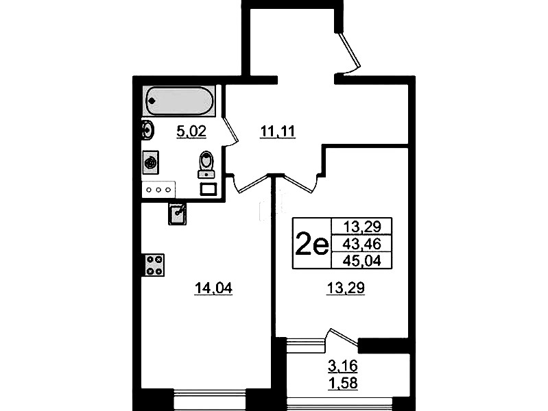 Однокомнатная квартира на 7-ом этаже 45,04 кв.м