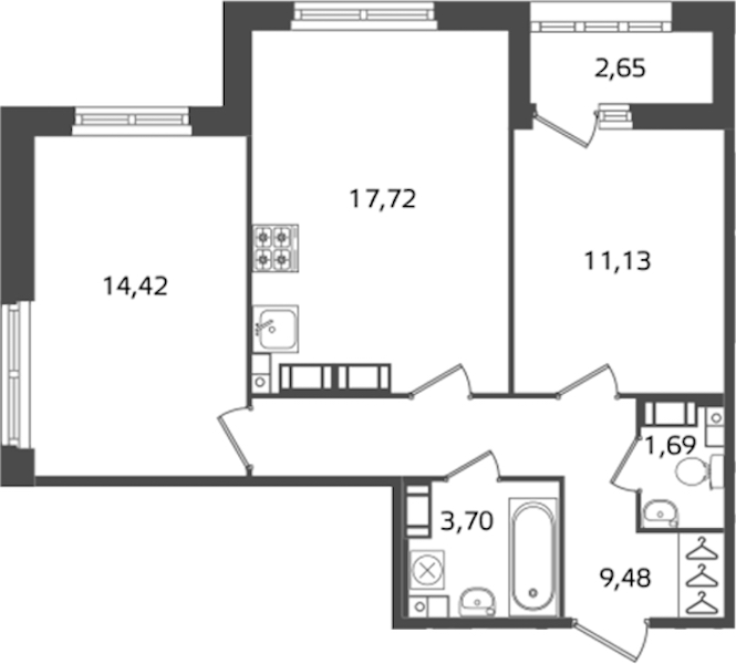 Двухкомнатная квартира на 13-ом этаже 58,14 кв.м