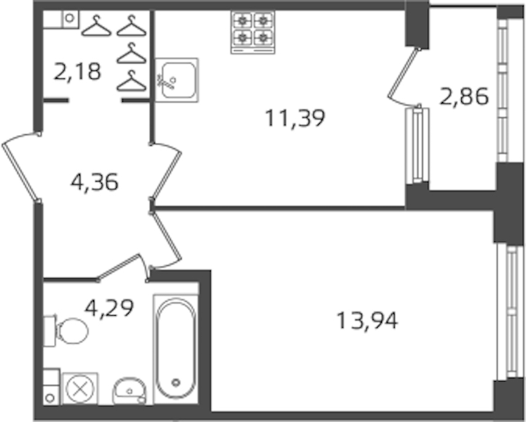 - Площадь кухни11,39 м2