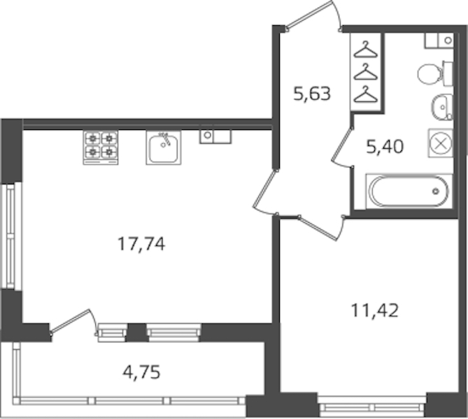 Однокомнатная квартира на 2-ом этаже 40,19 кв.м