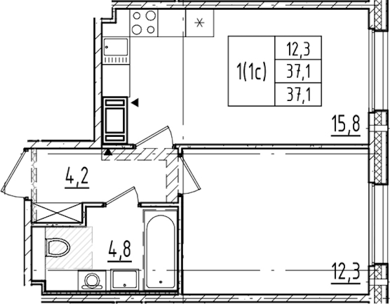 Однокомнатная квартира на 4-ом этаже 37,1 кв.м
