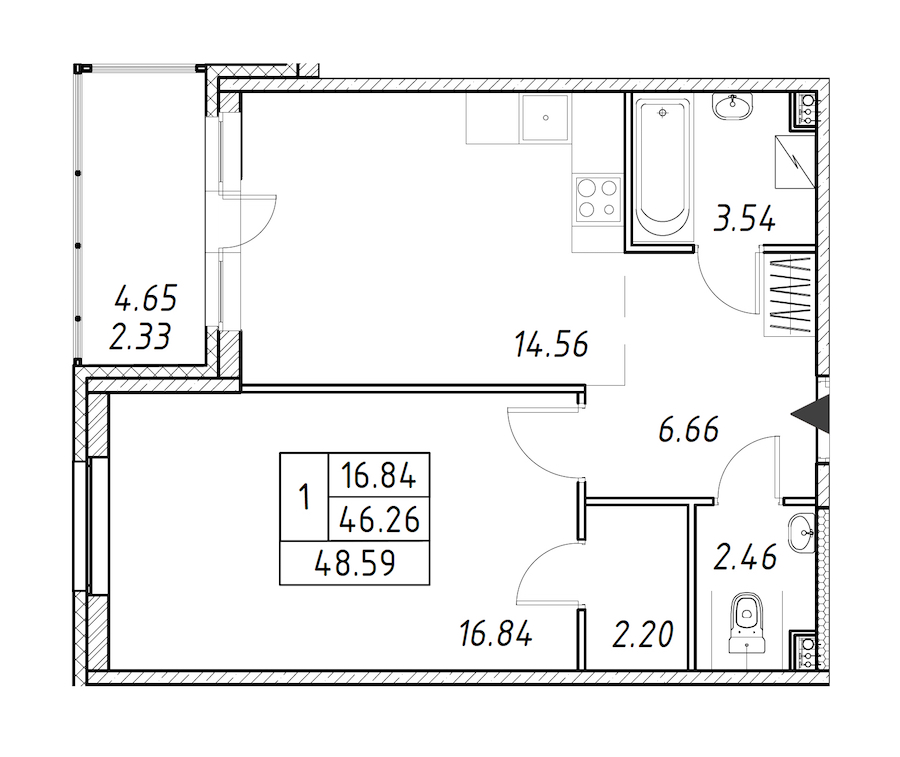 Однокомнатная квартира на 3-ем этаже 48,59 кв.м