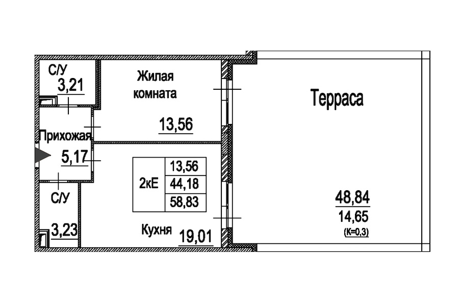 Однокомнатная квартира на 2-ом этаже 58,83 кв.м