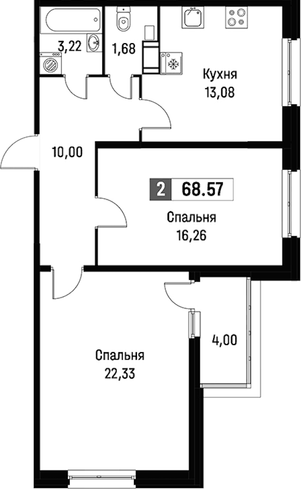 Двухкомнатная квартира на 2-ом этаже 68,57 кв.м