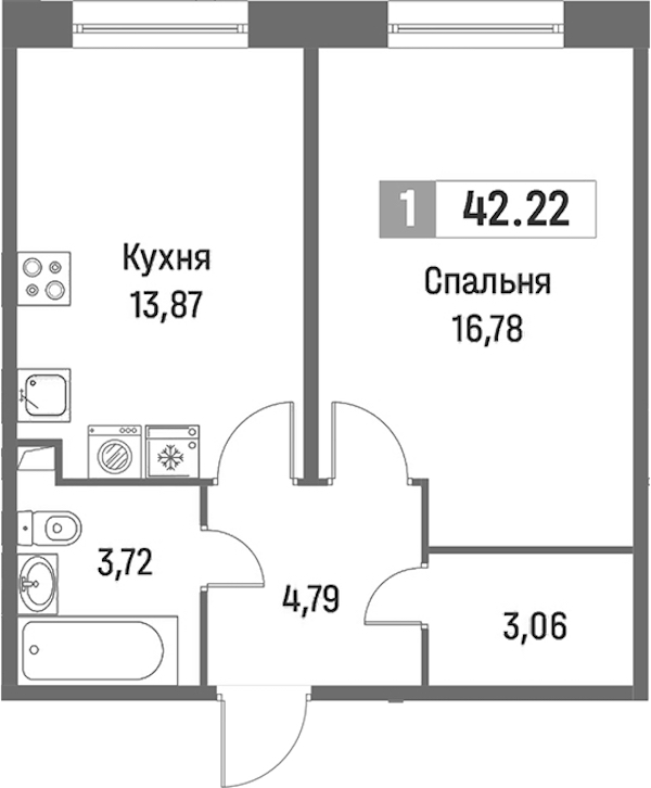 Однокомнатная квартира на 1-ом этаже 42,92 кв.м