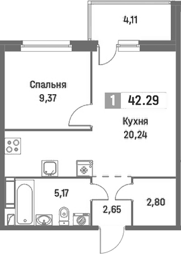 Однокомнатная квартира на 12-ом этаже 42,29 кв.м