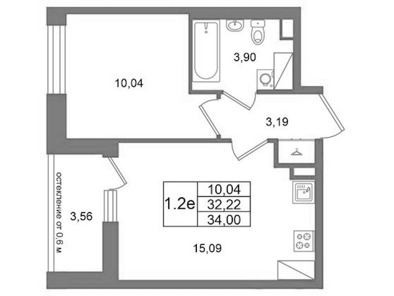 Однокомнатная квартира на 15-ом этаже 32,22 кв.м