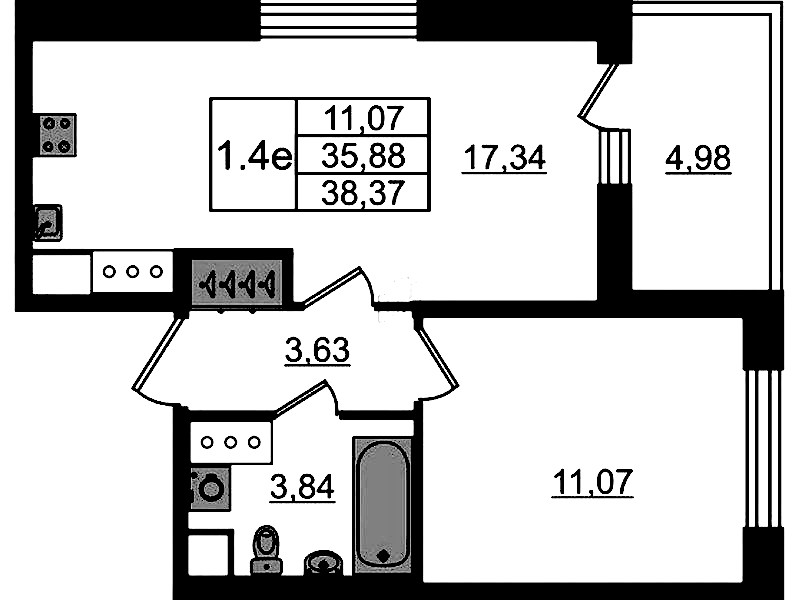 - Площадь кухни17,34 м2