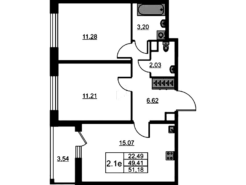 Двухкомнатная квартира на 1-ом этаже 49,41 кв.м