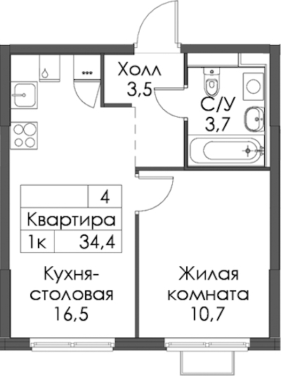 - Площадь34,4 м2