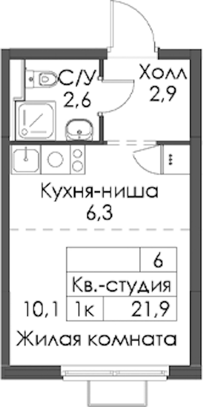 Квартира-студия на 6-ом этаже 21,9 кв.м