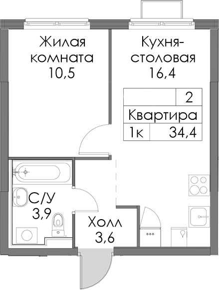 - Площадь34,4 м2