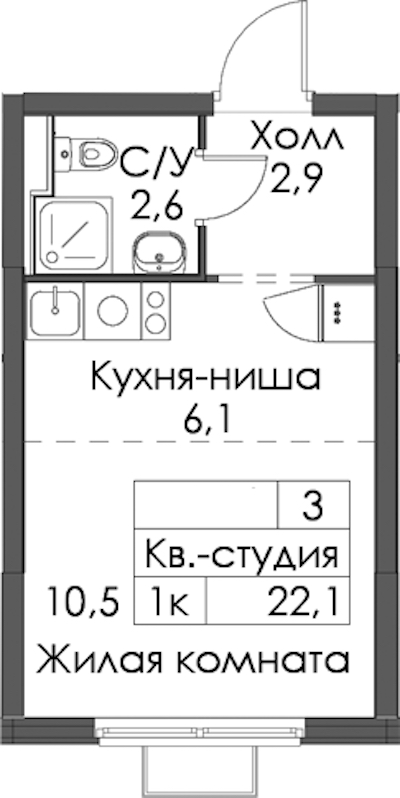 Квартира-студия на 14-ом этаже 22,1 кв.м