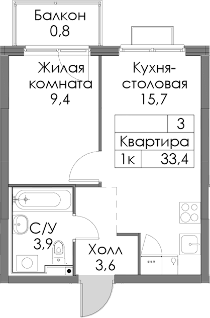 - Площадь33,4 м2