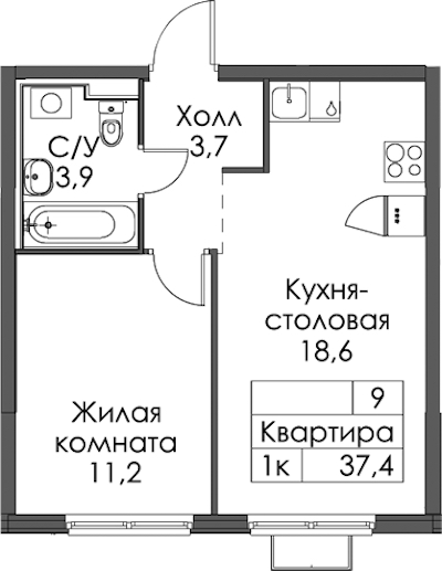 Однокомнатная квартира на 5-ом этаже 37,4 кв.м