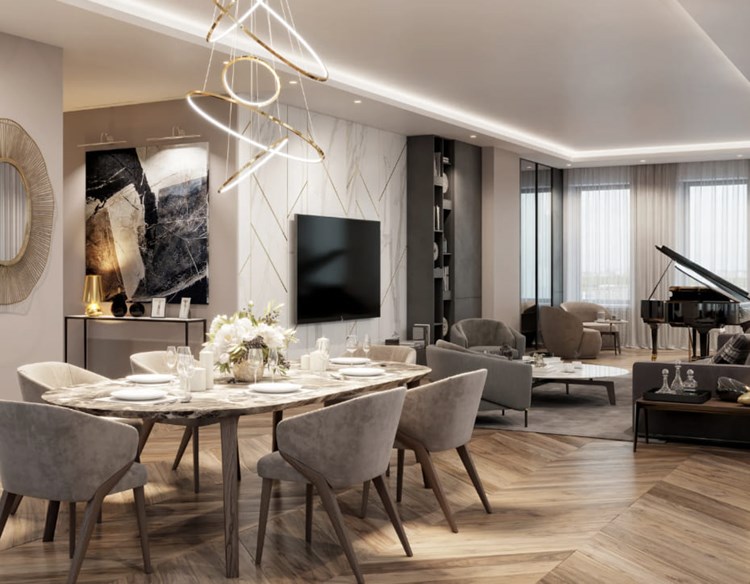 Планировки насыщены особенными форматами комнат: голливудские гостиные, анфиладные и двусторонние мастер-спальни. В зависимости от метража квартиры, в кухне-гостиной может быть выделена столовая зона, коктейльный корнер или скрытая кухня-ниша.