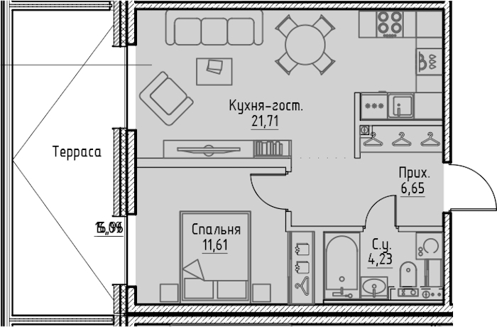 Однокомнатная квартира на 1-ом этаже 44,2 кв.м