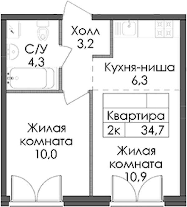- Площадь34,7 м2