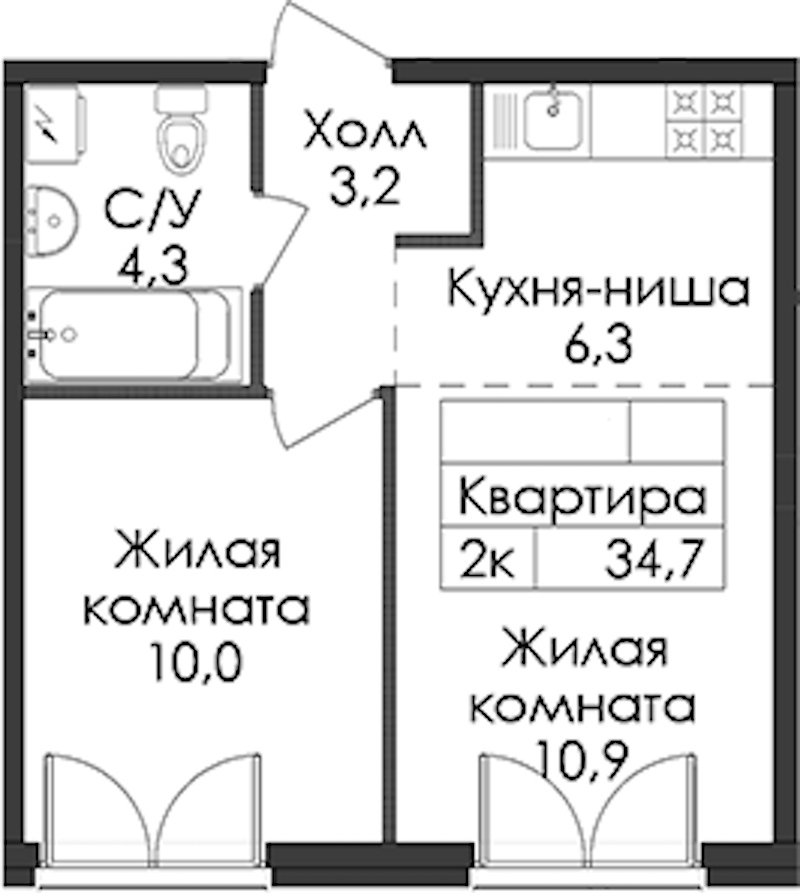 - Площадь34,7 м2