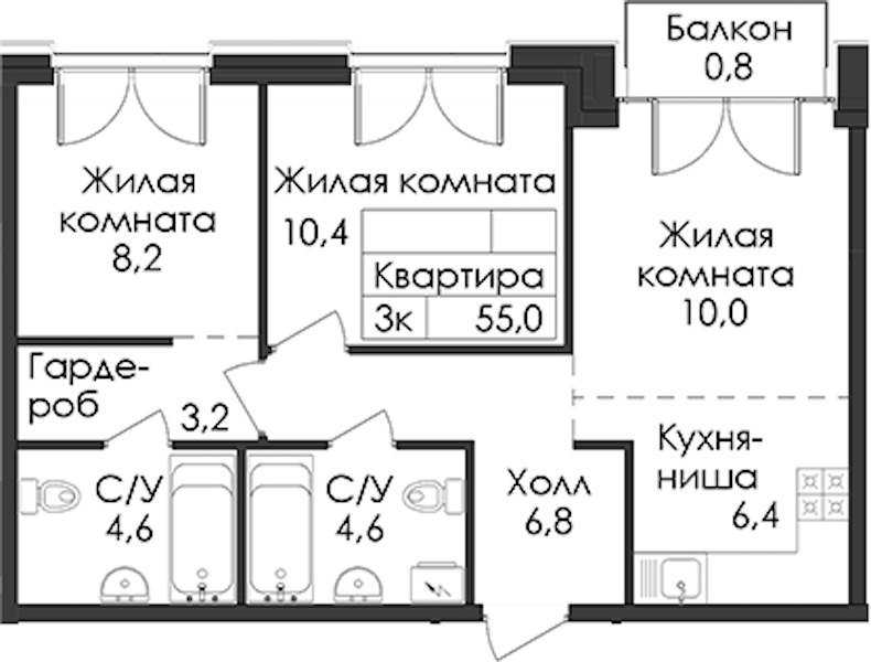 • Площадь55,1 м2