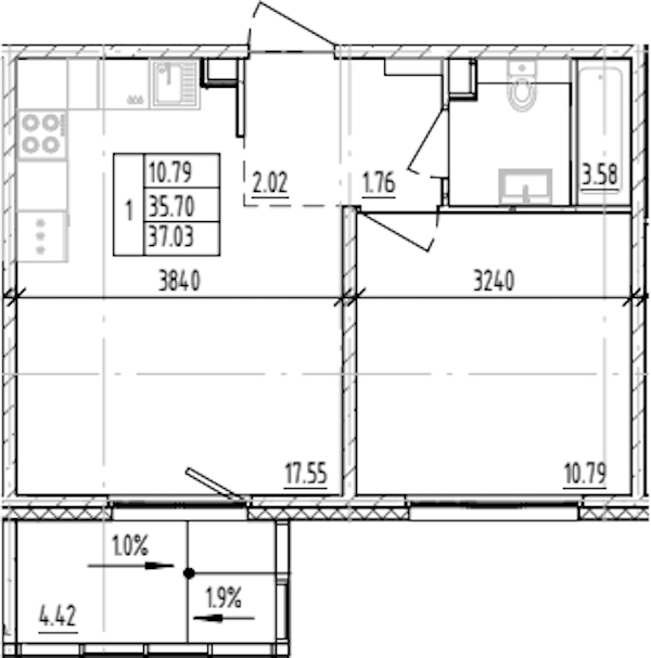 Однокомнатная квартира на 11-ом этаже 37,03 кв.м